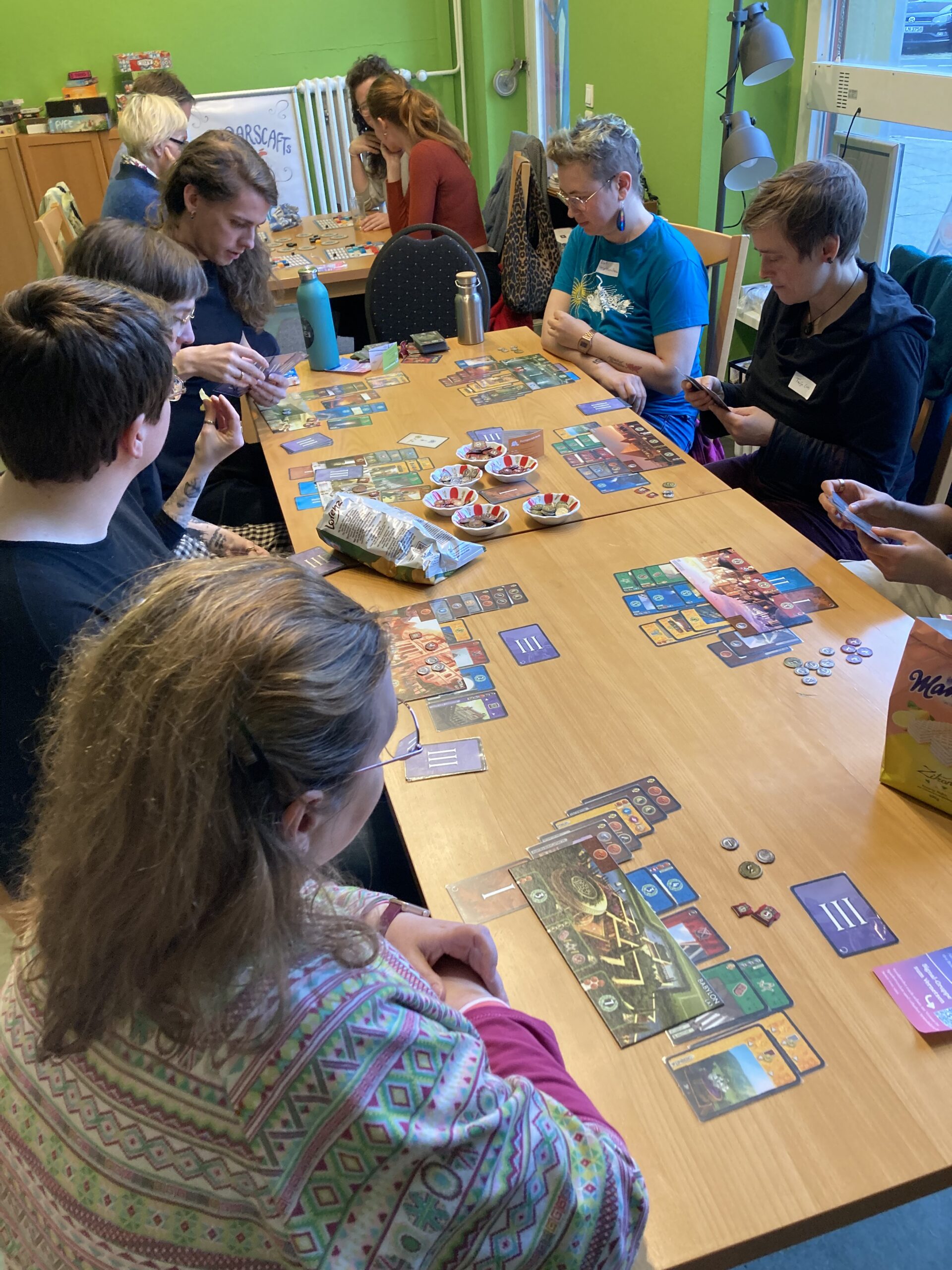 Knapp 20 FLINTA*-Teilnehmende lernen in dem neunmonatigen, kostenlosen Workshopprogramm alle Aspekte des Brettspieldesigns kennen: von der ersten Idee über Spielmechaniken und Prototyping bis hin zu Grafik, Marketing und Diskriminierung.
