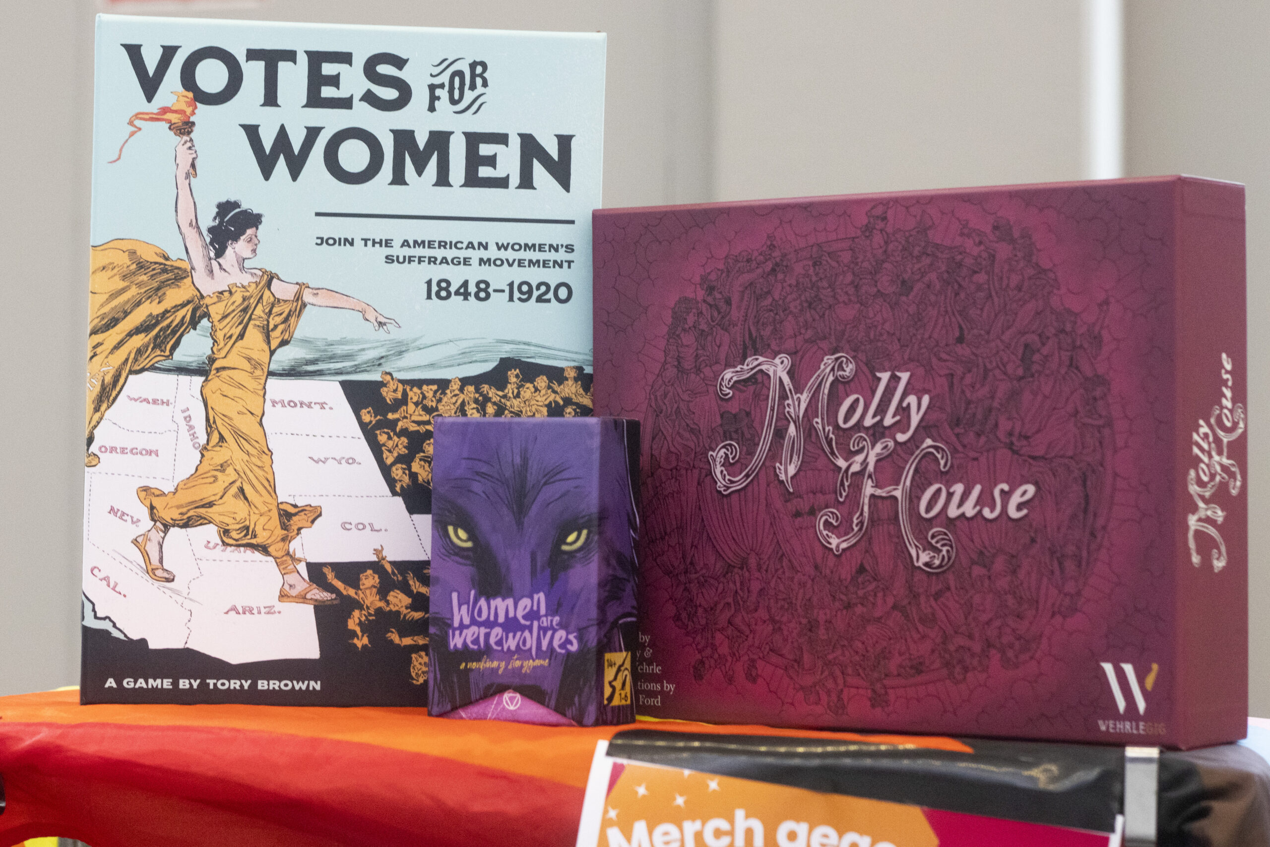 Bei vier Verlagen – Pegasus, TOPP, Board Game Circus und Hans im Glück – konnte man neben Spendenkassen und Infomaterial auch Merch von FLINTA*stisch finden.